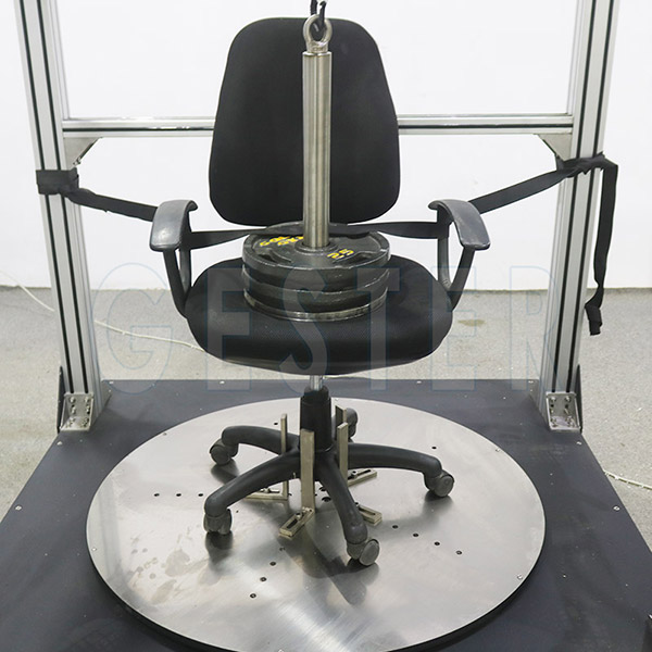 Chair swivel durability test:The base of the chair shall be secured on a rotating table so that the rotating axis of the chair coincides with the rotating axis of the table. The upper part of the chair shall be loosely fixed in such a way as not to hinder the rotation of the base. Load the seat in loading point with the specified additional load. Then rotate the chair at the specified rate and angle. Change direction after each rotation. Thus, durability of the chair’s swivel structure could be tested.