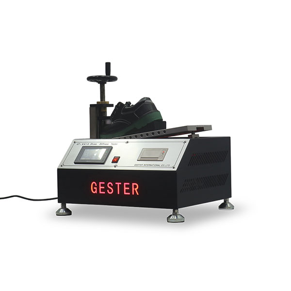 As the name implies, the shoe stiffness tester is used to test the bending resistance of the shoes. The shoe stiffness testing machine is particularly suitable for the shoe in the size of 39, 42(France), and 6, 8 (UK). A fixture is installed to clamp the shoe front. The 1/3 of the forefoot shall be located at the spindle. Actuated by the motor, the belt pulley drives the rotating plate to exert 30N force on the shoe at the speed of 100mm/min. A decoder is engineered on the spindle of the footwear stiffness tester to detect the rotation angle of the rotating plate. The value obtained is then indicated on the display of the shoe stiffness testing equipment.