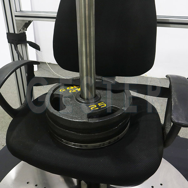 Chair swivel durability test:The base of the chair shall be secured on a rotating table so that the rotating axis of the chair coincides with the rotating axis of the table. The upper part of the chair shall be loosely fixed in such a way as not to hinder the rotation of the base. Load the seat in loading point with the specified additional load. Then rotate the chair at the specified rate and angle. Change direction after each rotation. Thus, durability of the chair’s swivel structure could be tested.